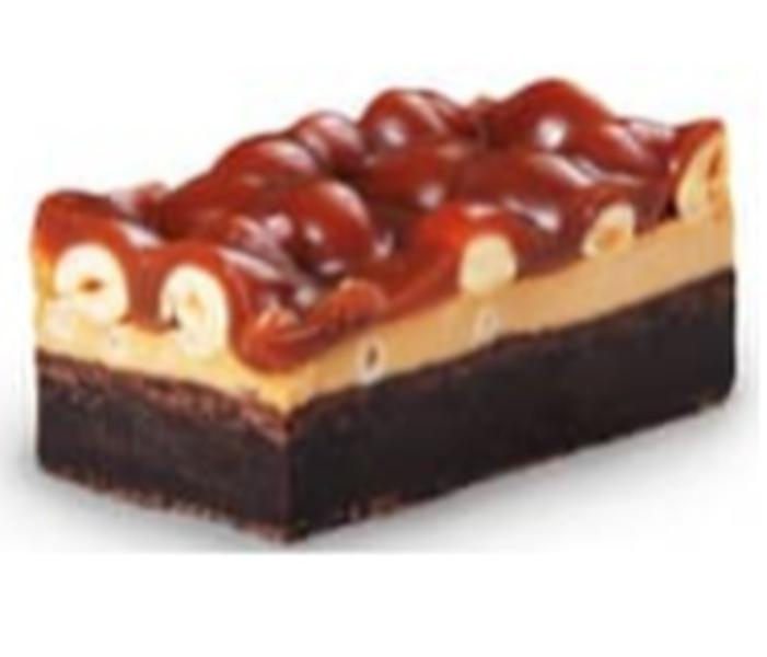 Состав: Шоколадный брауни с тянучкой из сливочной пасты, покрыт толстым слоем мягкой сливочной карамели и лесным орехом