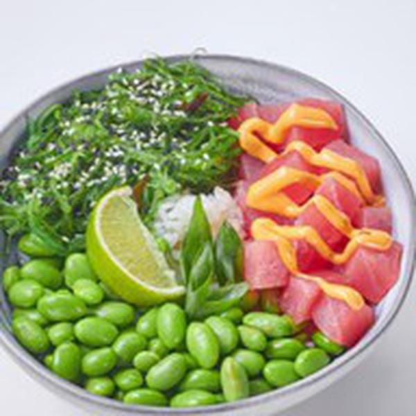 Состав: Тунец, бобы эдамаме, водоросли чука, зеленый лук, кунжут, ореховый соус, спайси соус, поке соус, лайм, рис.