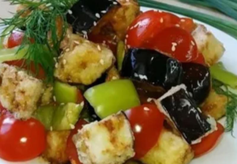 Состав: Баклажан жареный в панировке, томат, сыр творожный, соевый соус , чили сладкий