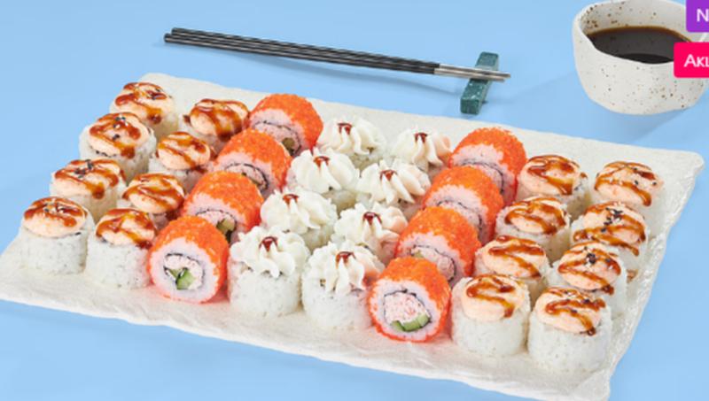 Состав: Белоснежка (8 шт.), Калифорния супер лайт (8 шт.), Аква (8 шт.), Мураками (8 шт.) *Не забудьте заказать имбирь, васаби и соевый соус. Они не входят в стоимость заказа.