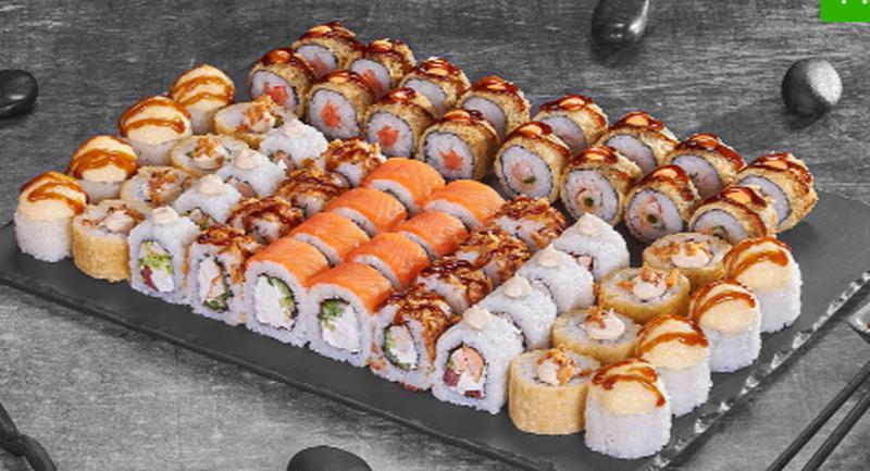 Состав: Филадельфия лайт сяке (8 шт.), Куритос (8 шт.), Чикен Дон (8 шт.), Мистер крабс запеченный (8 шт.), Чикен темпура (8 шт.), Сяке лайт темпура (8 шт.), Бекон Лайт темпура (8 шт.)