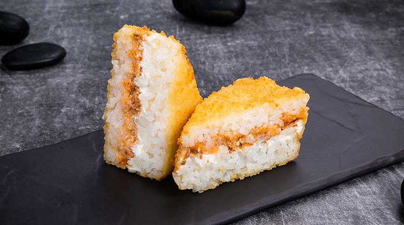 Состав: Лосось терияки, сливочный сыр, спайси соус, темпурный кляр, панировочные сухари, рис